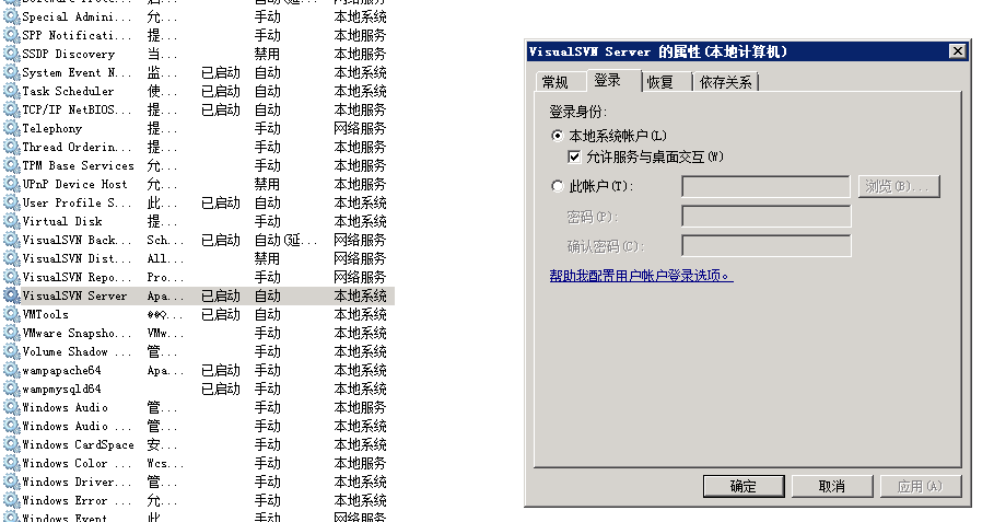 按 `win+R`快捷键, 在运行窗口中输入` services.msc`, 回车,在弹出的“服务”窗口中, 找到visual svn server 服务 ,右键属性 ,先停止服务之后,设置如下: