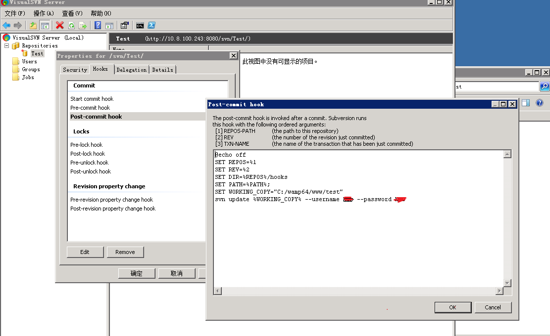 在实际项目中,一般都要用到版本控制工具。这篇文章是关于版本控制工具 VisualSVN,对于网站(在线系统)类项目,我们在 commit 的同时,也希望新提交的代码能自动部署到服务器目录,便要用到钩子(hook)功能,具体配置的是 post-commit,如下图: