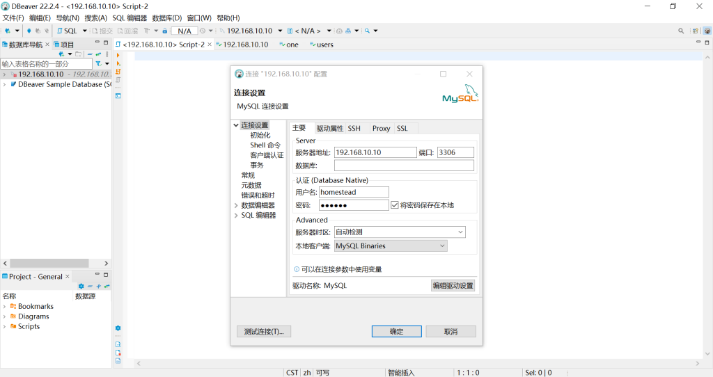 下载安装 MySql Workbench(https://dev.mysql.com/downloads/workbench/) 、DBeaver(https://dbeaver.io/download/) 或其他数据库管理工具,默认服务器地址:192.168.10.10,用户名:homestead,密码:secret,一个示例: