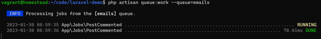 然后在控制台运行 php artisan queue:work --queue=emails 命令: