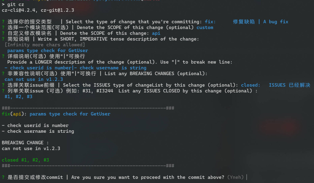 比较了相关的项目,推荐使用 commitizen/cz-cliZhengqbbb/cz-git 组合使用(其他工具在涉及换行等需要时,可能存在问题)