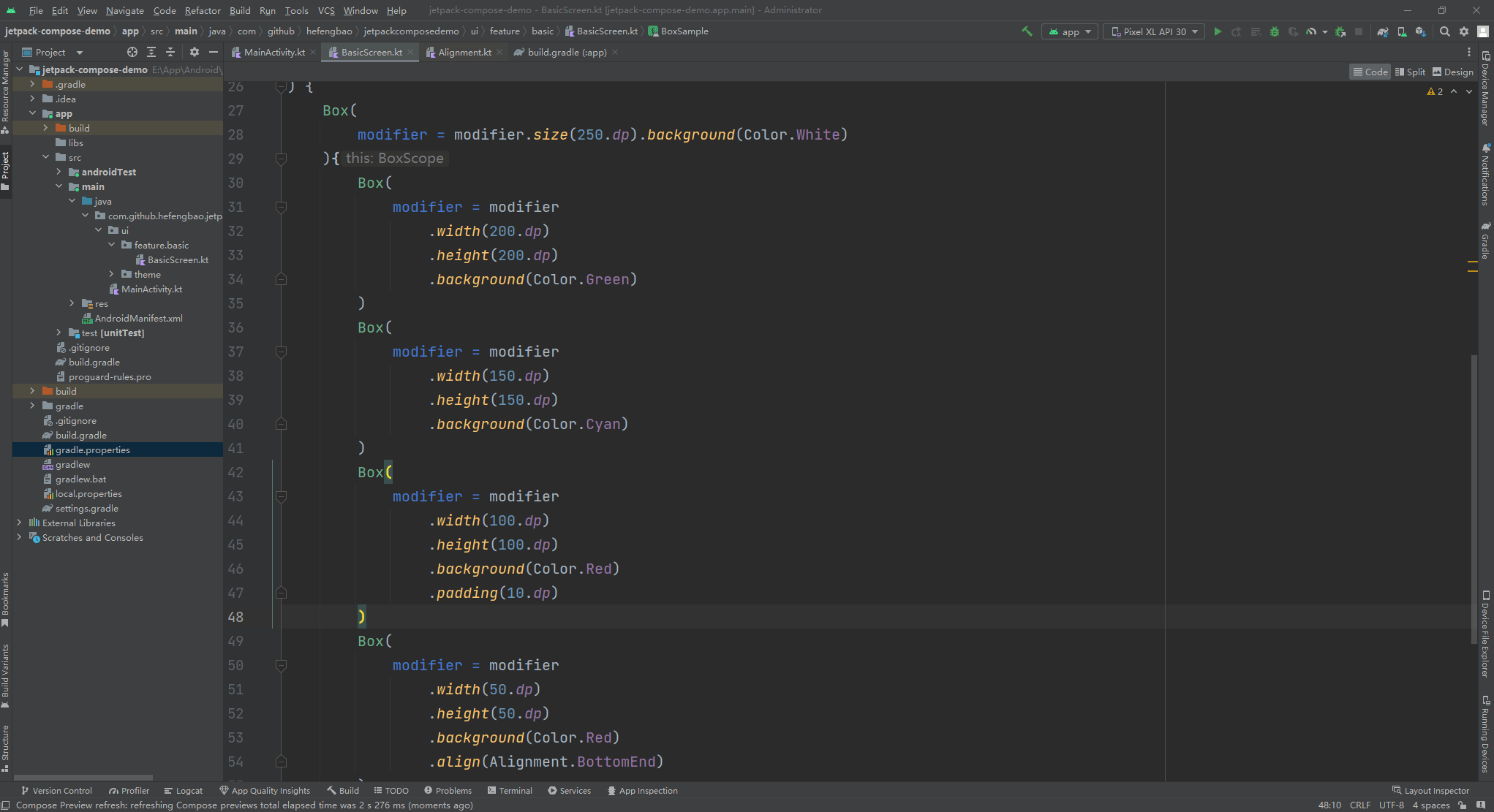 2、设置元素大小:size() 设定长度、高相同, width() 和 height() 分别设定长度和高度,还有 fillMaxWidth() 和 fillMaxHeight() 以及 fillMaxSize() ,则是自适应宽度和高度。