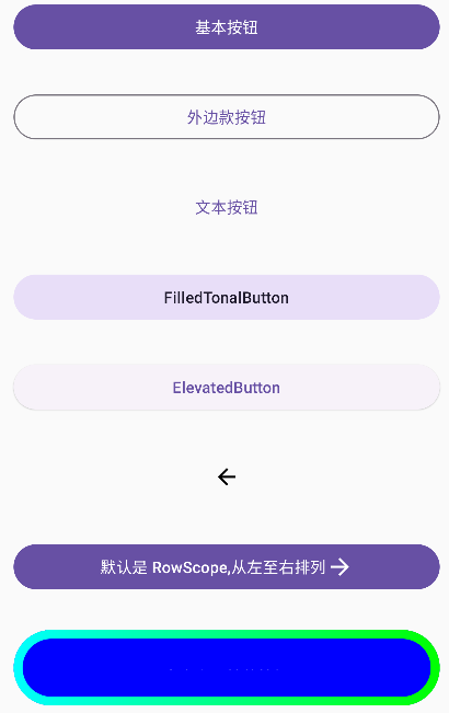 按钮 Button 是 material3(androidx.compose.material3.Button)组件,常用的还有 OutlinedButtonTextButtonIconButtonFilledTonalButtonElevatedButton