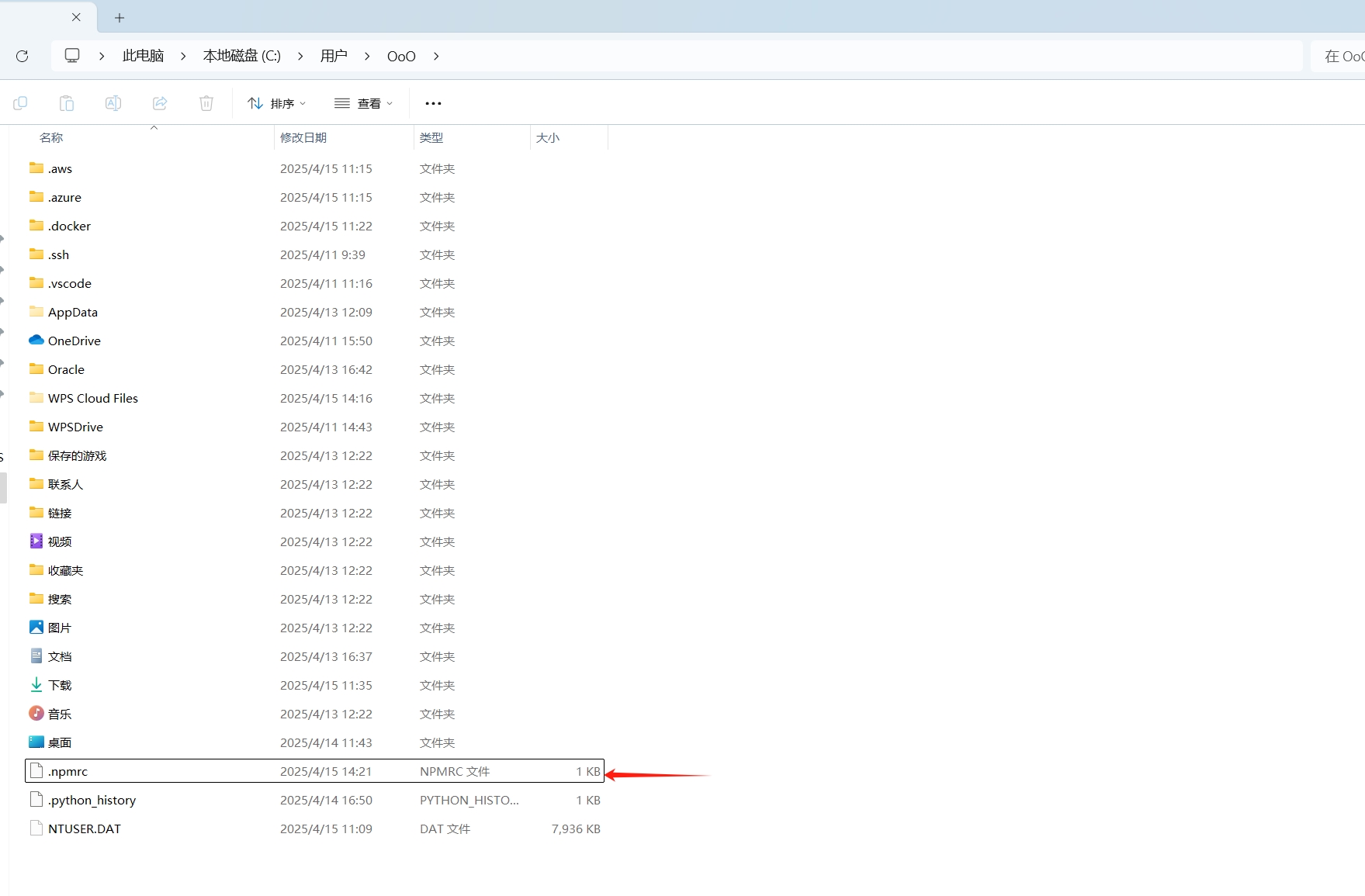 保存在C:\Users\{用户名} 目录下的 .npmrc 文件: