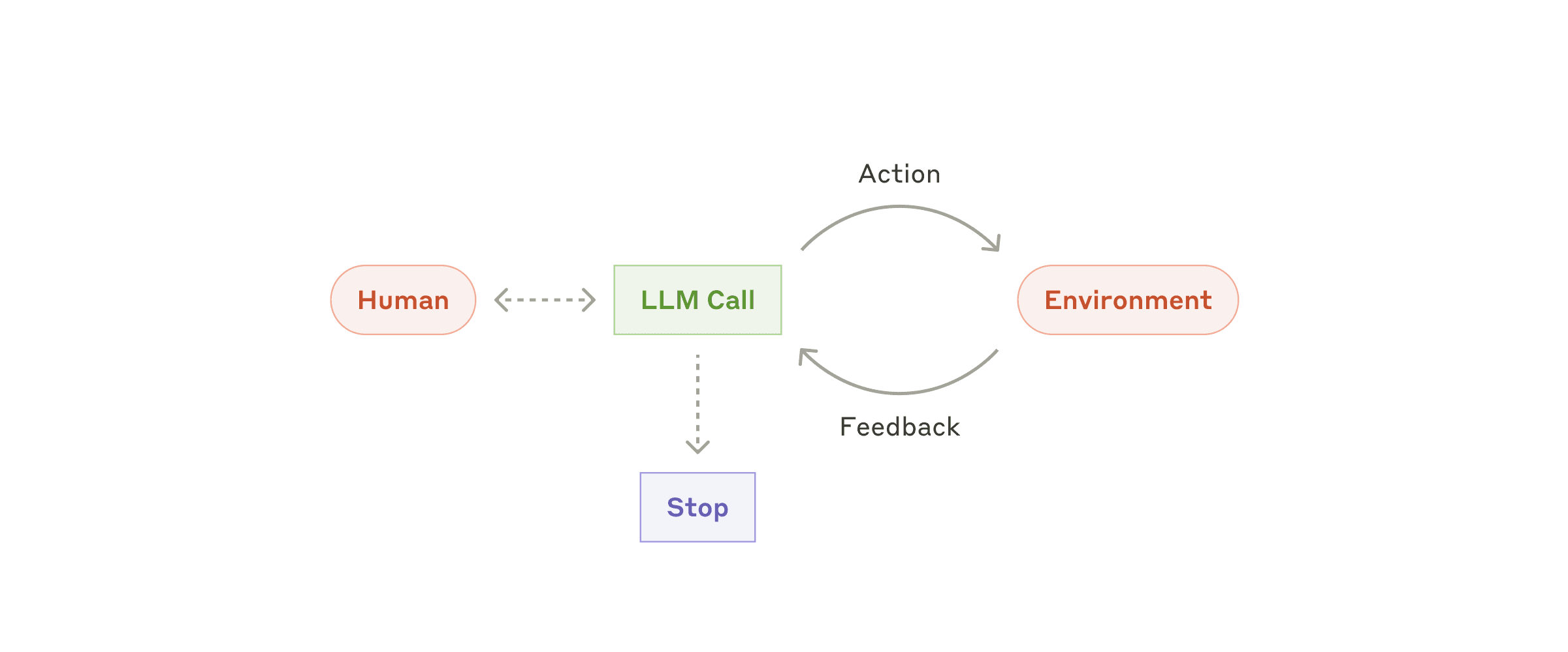 智能体开始工作时,会接收人类用户的指令或与其进行交互讨论。一旦任务明确,智能体便独立进行规划和操作,并可能在需要时返回人类处寻求更多信息或判断。在执行过程中,智能体在每个步骤都从环境中获取“真实反馈”(ground truth)(例如工具调用结果或代码执行结果)以评估其进展。智能体可以在检查点(checkpoints) 或遇到阻碍(blockers) 时暂停,等待人类反馈。任务通常在完成后终止,但也常会设置停止条件(stopping conditions)(例如最大迭代次数)以保持控制。