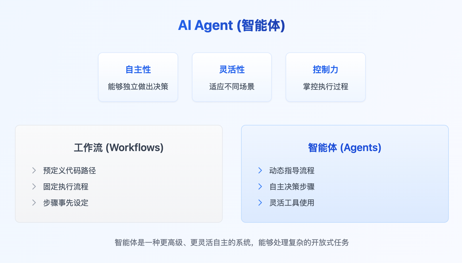 - 智能体(Agents)则是指由 LLM 动态引导自身流程和工具使用的系统,保持对任务完成方式的控制权。