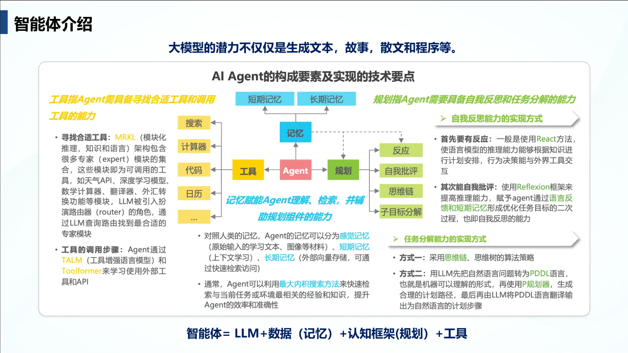 Agent(智能体)=LLM(大模型)+ Planning(规划)+Memory(记忆)+ Tools(工具)